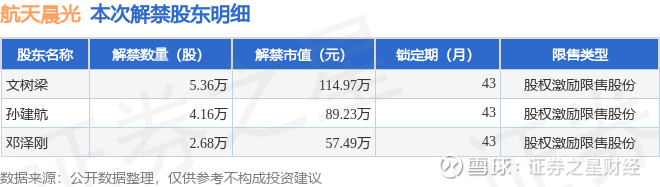 证券之星消息,根据市场公开信息整理,航天晨光(600501)于12月2日将有12.2万股限售股份解禁,为公司股权激励限售股份,占公司总股本0.03%。(本次数据根据历史公告整理得出,实际情况以上市公司最新公告为准)最近一年内,该股累计解禁310.38万股,占总股本的0.73%。本次解禁后,公司已无限售股份。具体如下图所示: