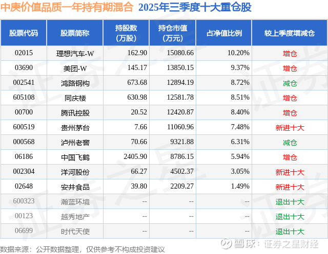 中庚价值品质一年持有期混合的前十大重仓股如下: