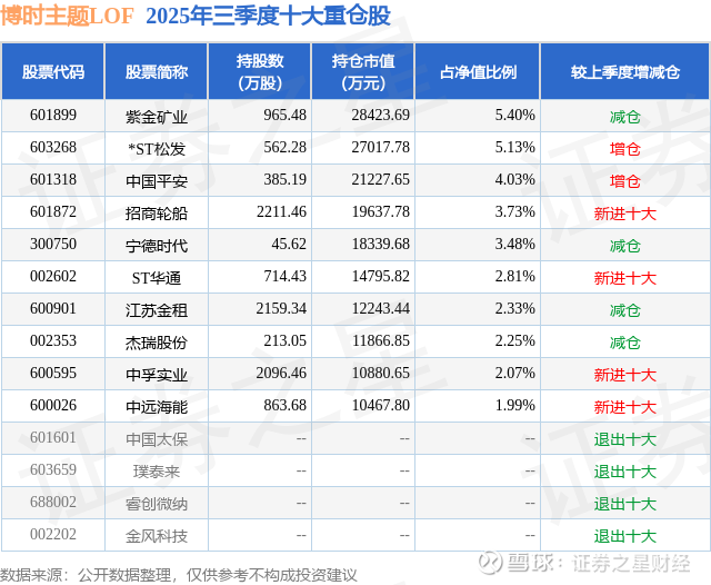 博时主题LOF的前十大重仓股如下: