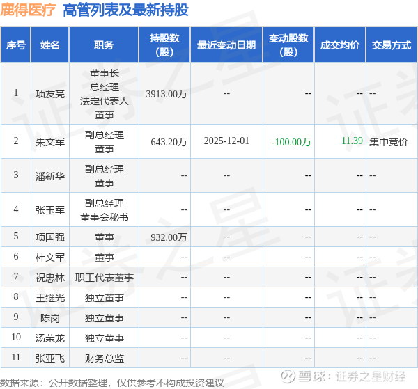 鹿得医疗近半年内的董监高及核心技术人员增减持详情如下: