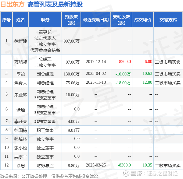 日出东方的高管列表及最新持股情况如下: