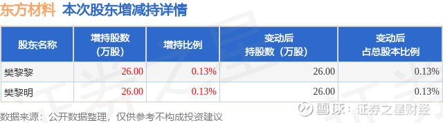 证券之星消息,12月2日东方材料发布公告《东方材料:新东方新材料股份有限公司关于持股5%以上股东及其一致行动人权益变动触及1%刻度的提示性公告》,其股东樊黎黎、樊黎明于2025年12月1日至2025年12月2日间合计增持52.0万股,占公司目前总股本的0.2584%,变动期间该股股价下跌0.44%,截止12月2日收盘报15.94元。