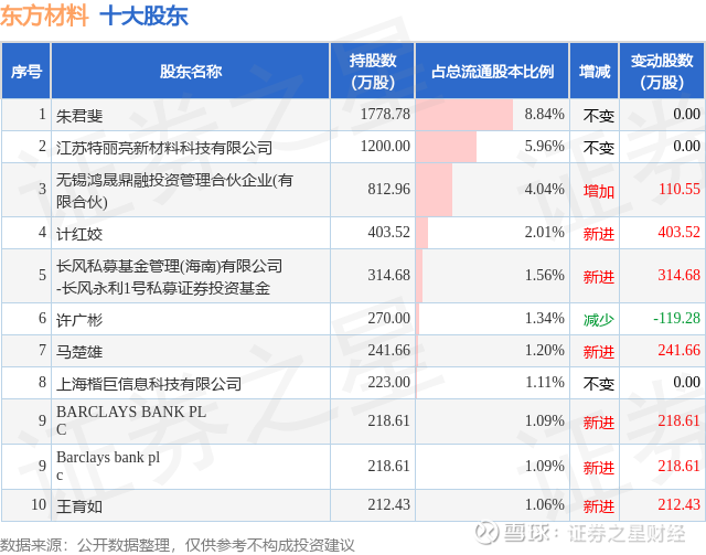 根据东方材料2025年三季报公布的十大股东详情如下: