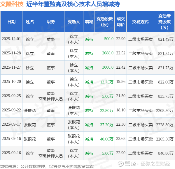 艾隆科技近半年内的董监高及核心技术人员增减持详情如下: