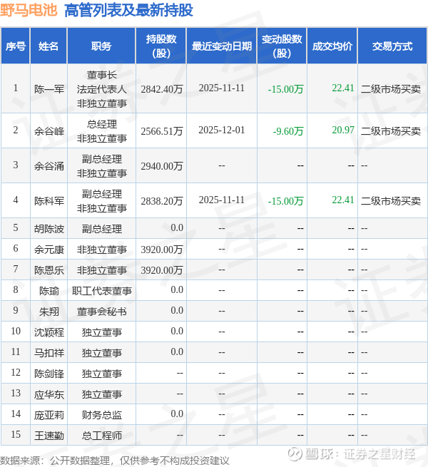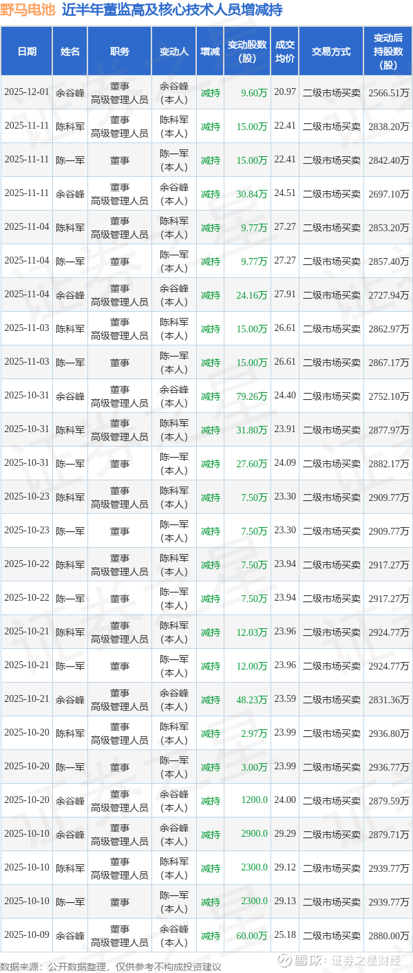 野马电池近半年内的董监高及核心技术人员增减持详情如下:
