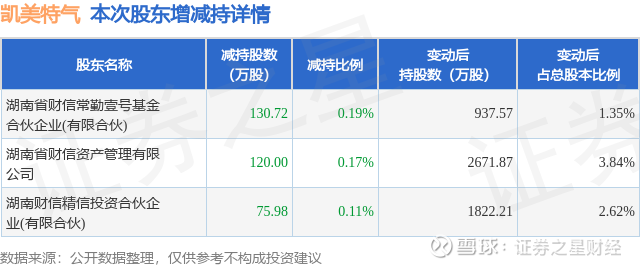 证券之星消息,12月2日凯美特气发布公告《凯美特气:关于股东及一致行动人权益变动持股比例触及1%刻度的公告》,其股东湖南省财信常勤壹号基金合伙企业(有限合伙)、湖南省财信资产管理有限公司、湖南财信精信投资合伙企业(有限合伙)于2025年12月1日至2025年12月2日间合计减持326.7万股,占公司目前总股本的0.4699%,变动期间该股股价上涨3.14%,截止12月2日收盘报22.97元。