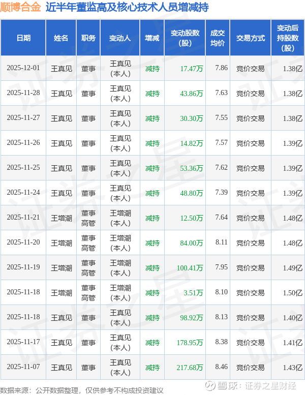 顺博合金近半年内的董监高及核心技术人员增减持详情如下: