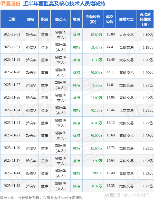 侨银股份近半年内的董监高及核心技术人员增减持详情如下:
