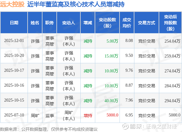 远大控股近半年内的董监高及核心技术人员增减持详情如下: