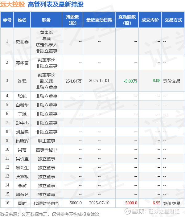 远大控股的高管列表及最新持股情况如下: