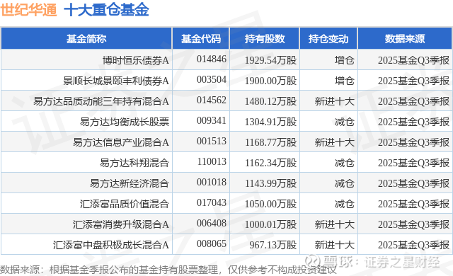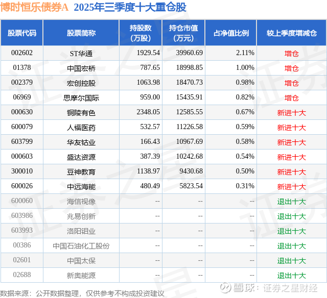 根据2025基金Q3季报公募基金重仓股数据,重仓该股的公募基金共274家,其中持有数量最多的公募基金为博时基金的博时恒乐债券A。博时恒乐债券A目前规模为108.07亿元,最新净值1.1987(12月2日),较上一交易日下跌0.12%,近一年上涨7.32%。该公募基金现任基金经理为张李陵。张李陵在任的基金产品包括:博时信用债纯债债券A,管理时间为2020年7月13日至今,期间收益率为21.35%;博时恒泽混合A,管理时间为2021年2月8日至今,期间收益率为17.53%;博时恒泰债券A,管理时间为2021年4月22日至今,期间收益率为17.9%;博时博盈稳健6个月持有期混合A,管理时间为2021年8月10日至今,期间收益率为-4.08%。