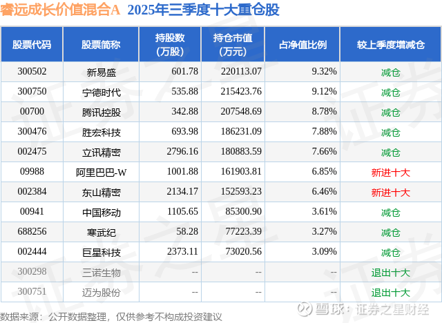 睿远成长价值混合A的前十大重仓股如下: