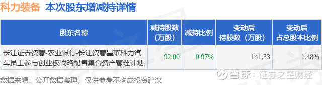 证券之星消息,12月3日科力装备发布公告《科力装备:关于员工战略配售资管计划股份减持期限届满暨实施情况的公告》,其股东长江证券资管-农业银行-长江资管星耀科力汽车员工参与创业板战略配售集合资产管理计划于2025年9月16日至2025年11月14日间合计减持92.0万股,占公司目前总股本的0.9664%,变动期间该股股价下跌8.94%,截止11月14日收盘报39.34元。