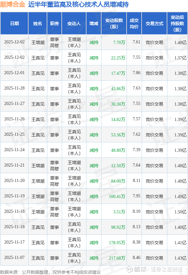 顺博合金近半年内的董监高及核心技术人员增减持详情如下: