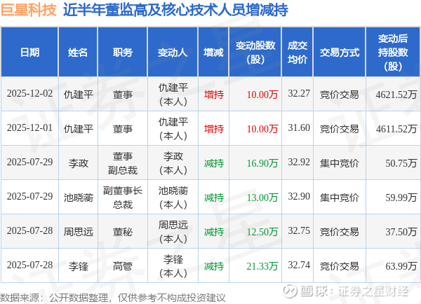 巨星科技近半年内的董监高及核心技术人员增减持详情如下: