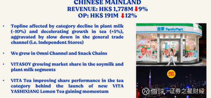 豆奶和柠檬茶是维他奶主要的收入来源。尽管报告期内来自内地市场的收入疲软,但维他奶的豆奶及植物奶产品的市场份额均有所增长,另外维他茶广泛采用更具竞争力的定价策略,并推出新产品维他鸭屎香柠檬茶,从而提升其在即饮茶类别中的市场份额。