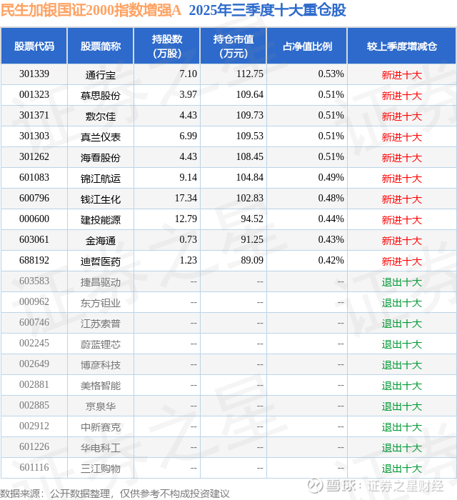 民生加银国证2000指数增强A的前十大重仓股如下: