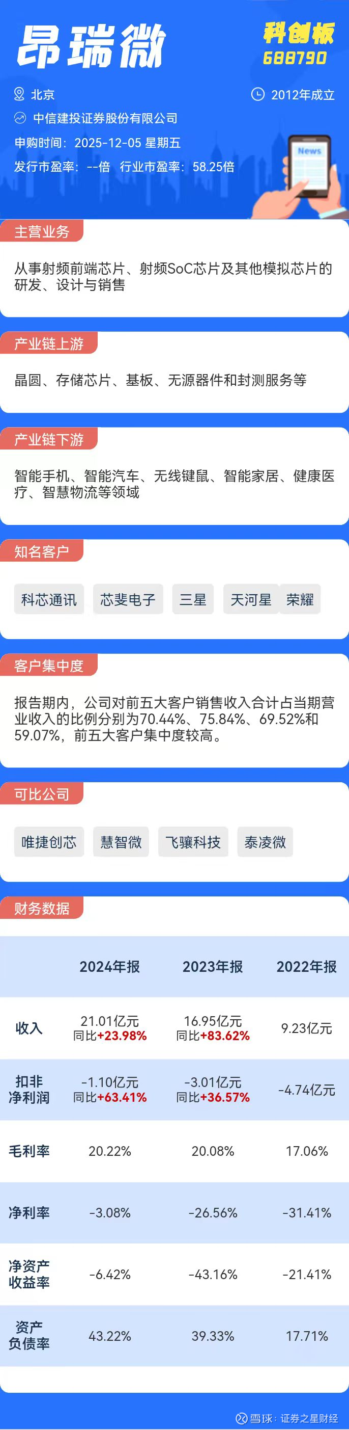 从估值看,公司目前尚未实现盈利,在近期新股中较为罕见,但考虑到公司的科技属性,及近一年多新股首日赚钱效应明显,综合判断昂瑞微首日破发概率较小。