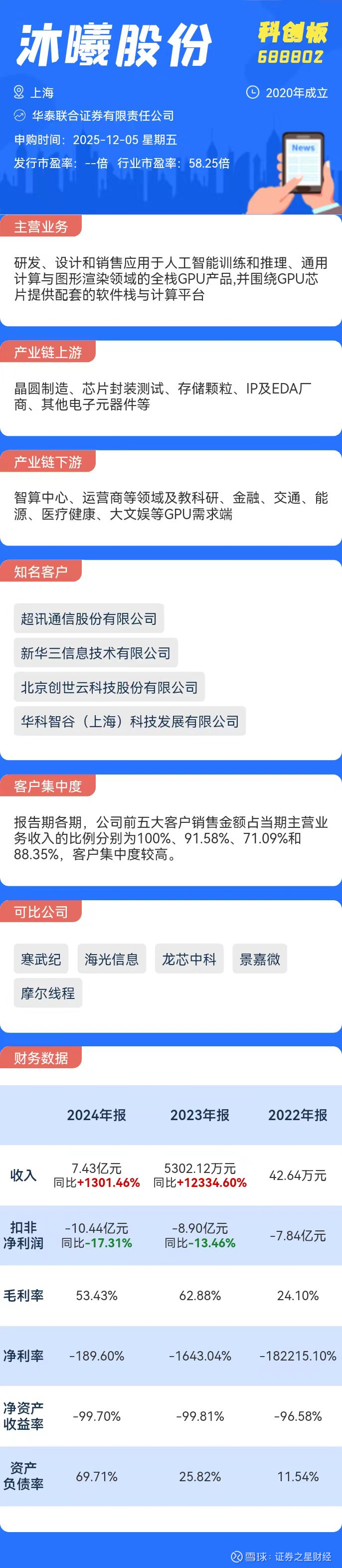 公司业绩方面,2022年至2024年,沐曦股份实现营业收入分别为42.64万元、5302.12万元、7.43亿元,复合增长率达4074.52%;净亏损分别为7.77亿元、8.71亿元、14.09亿元。公司预计2025年实现营收15.00亿元至19.80亿元,同比增长101.86%至166.46%,归母净利润为-7.63亿元至-5.27亿元,同比减亏45.84%至62.59%。公司预计达到盈亏平衡点的预期时间最早为2026年。
