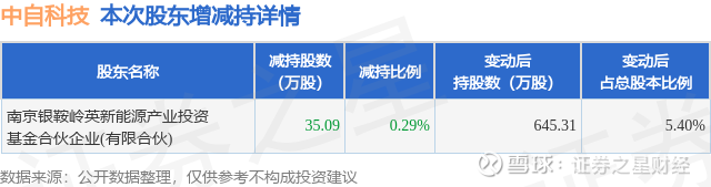 证券之星消息,12月4日中自科技发布公告《中自科技:中自科技股份有限公司关于持股5%以上股东减持股份结果公告》,其股东南京银鞍岭英新能源产业投资基金合伙企业(有限合伙)于2025年11月13日至2025年12月4日间合计减持35.09万股,占公司目前总股本的0.2935%,变动期间该股股价下跌10.13%,截止12月4日收盘报23.77元。