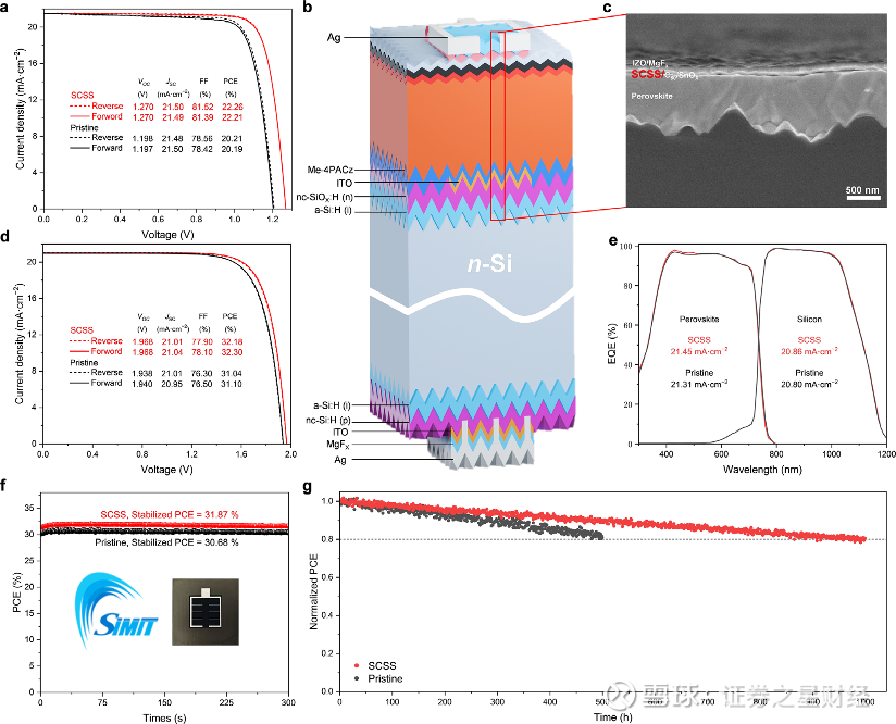 经上海微系统与信息技术研究所(SIMIT)第三方权威认证,基于SCSS策略的叠层电池实现32.12%的PCE,冠军器件效率更达32.3%。核心性能参数全维度提升:开路电压(Voc)从1.940V升至1.968V,填充因子(FF)从76.50%提升至78.10%,短路电流密度(Jsc)达21.04mA/cm²。尤为关键的是,器件在350-500nm蓝光波段的外量子效率(EQE)显著提升,表明钙钛矿与电子传输层的界面非辐射复合被有效抑制(减少能量损耗,提升光电转换利用率),为后续向40%+效率突破扫清核心障碍。