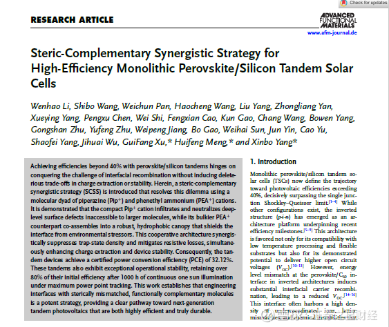 近日,协鑫集成联合苏州大学在空间互补协同策略(SCSS)方面的研究成果,成功发表于材料科学领域顶级期刊《Advanced Functional Materials》(简称AFM)。该成果所研发的钙钛矿/硅叠层太阳能电池,经第三方认证实现32.12%的光电转换效率(PCE),不仅破解了制约钙钛矿叠层电池量产的核心技术瓶颈,更为光伏行业迈向“40%+效率时代”筑牢关键技术根基。