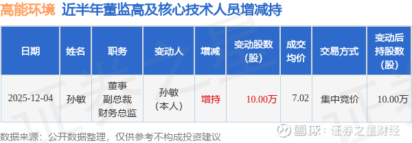 证券之星消息,根据12月4日市场公开信息、上市公司公告及交易所披露数据整理,高能环境(603588)最新董监高及相关人员股份变动情况:2025年12月4日公司董事,副总裁,财务总监孙敏共增持公司股份10.0万股,占公司总股本为0.0066%。变动期间公司股价上涨0.0%,12月4日当日收盘报7.03元。