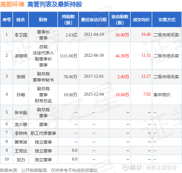 高能环境近半年内的董监高及核心技术人员增减持详情如下: