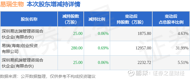 证券之星消息,12月4日易瑞生物发布公告《易瑞生物:关于控股股东及其一致行动人权益变动触及1%整数倍的提示性公告》,其股东深圳易达瑞管理咨询合伙企业(有限合伙)、易瑞(海南)创业投资有限公司、深圳易凯瑞管理咨询合伙企业(有限合伙)于2025年11月12日至2025年12月3日间合计减持330.0万股,占公司目前总股本的0.8146%,变动期间该股股价下跌5.97%,截止12月3日收盘报10.08元。