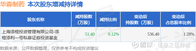 证券之星消息,12月4日华森制药发布公告《华森制药:关于控股股东及其一致行动人持股变动触及1%整数倍的公告》,其股东上海添橙投资管理有限公司-添橙添利一号私募证券投资基金于2025年11月7日至2025年12月3日间合计减持51.4万股,占公司目前总股本的0.1231%,变动期间该股股价下跌1.29%,截止12月3日收盘报16.08元。