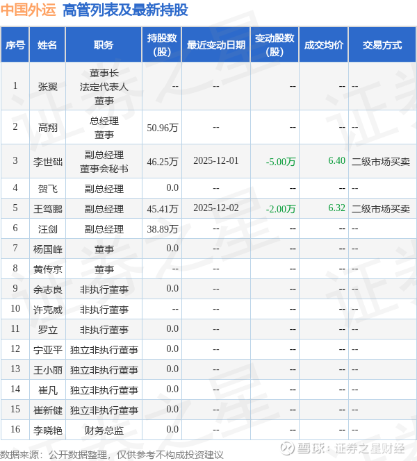 中国外运的高管列表及最新持股情况如下: