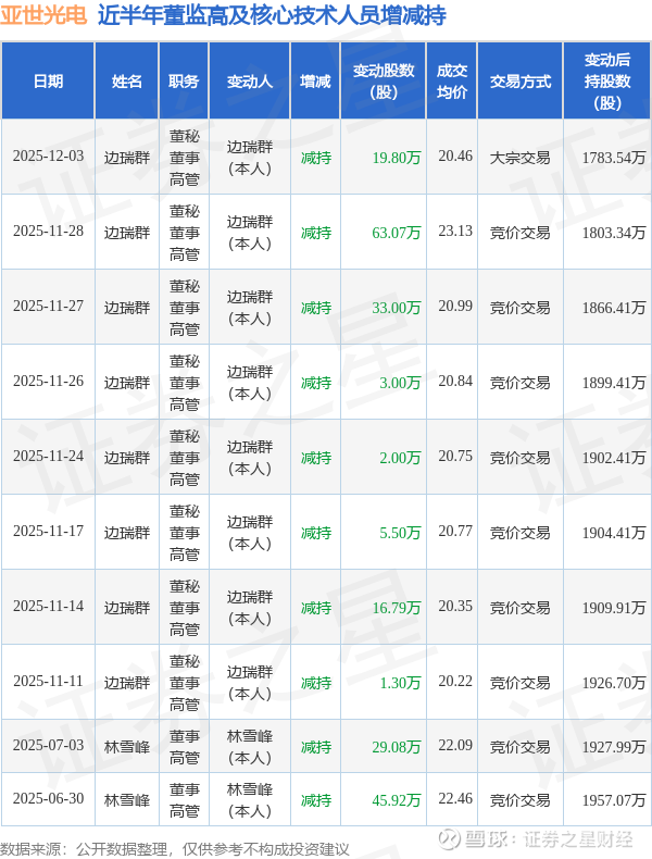 证券之星消息,根据12月4日市场公开信息、上市公司公告及交易所披露数据整理,亚世光电(002952)最新董监高及相关人员股份变动情况:2025年12月3日公司董秘,董事,高管边瑞群共减持公司股份19.8万股,占公司总股本为0.1205%。变动期间公司股价上涨3.91%,12月3日当日收盘报23.36元。