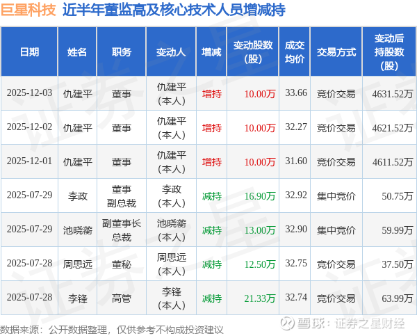 巨星科技近半年内的董监高及核心技术人员增减持详情如下: