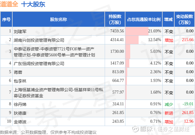 证券之星消息,12月4日道道全发布公告《道道全:关于股东增持股份计划进展暨权益变动触及1%刻度的提示性公告》,其股东湖南兴创投资管理有限公司于2025年11月6日至2025年12月4日间合计增持178.12万股,占公司目前总股本的0.5178%,变动期间该股股价下跌1.21%,截止12月4日收盘报10.6元。