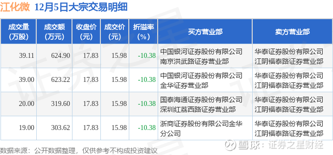证券之星消息,12月5日江化微发生大宗交易,交易数据如下: