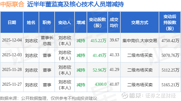 证券之星消息,根据12月5日市场公开信息、上市公司公告及交易所披露数据整理,中际联合(605305)最新董监高及相关人员股份变动情况:2025年11月27日至2025年12月3日公司董事刘志欣共减持公司股份94.88万股,占公司总股本为0.4464%。变动期间公司股价上涨1.08%,12月3日当日收盘报41.3元。