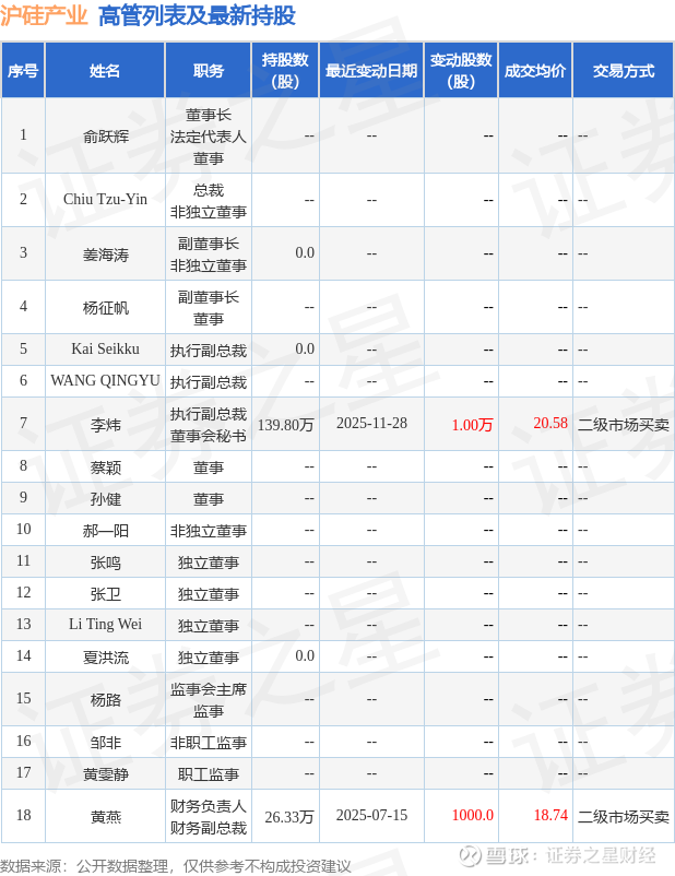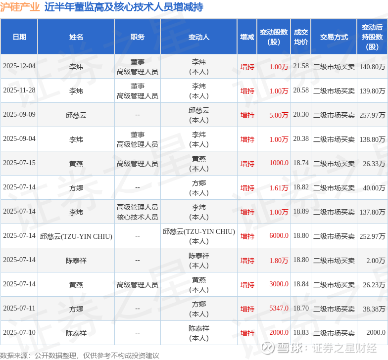 沪硅产业近半年内的董监高及核心技术人员增减持详情如下: