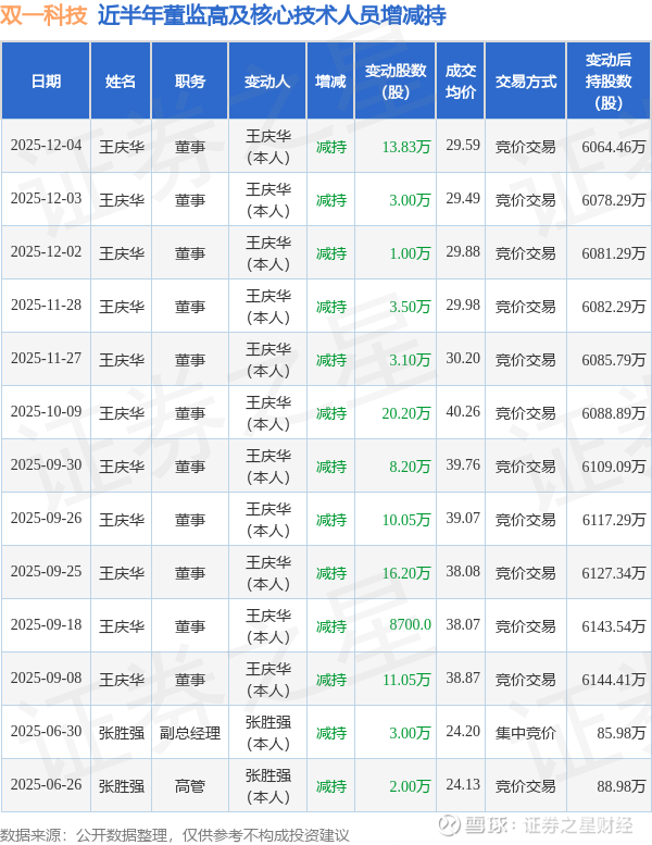 双一科技近半年内的董监高及核心技术人员增减持详情如下: