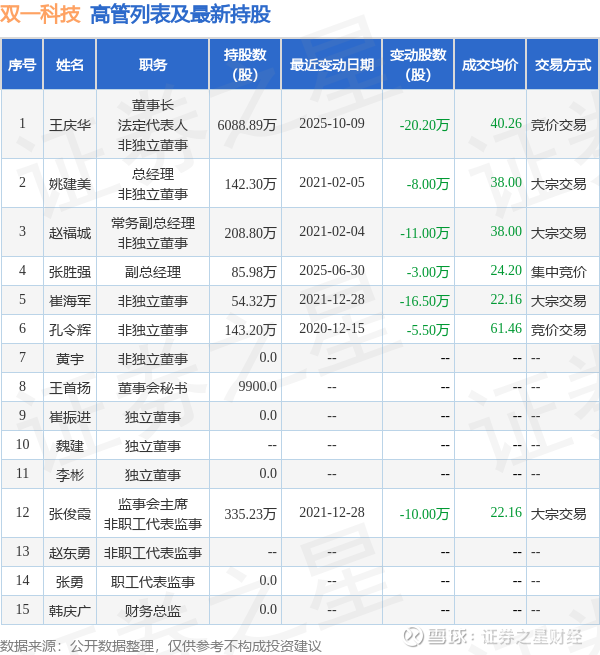 双一科技的高管列表及最新持股情况如下: