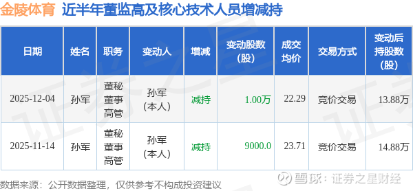 证券之星消息,根据12月5日市场公开信息、上市公司公告及交易所披露数据整理,金陵体育(300651)最新董监高及相关人员股份变动情况:2025年12月4日公司董秘,董事,高管孙军共减持公司股份1.0万股,占公司总股本为0.0071%。变动期间公司股价上涨4.62%,12月4日当日收盘报22.2元。