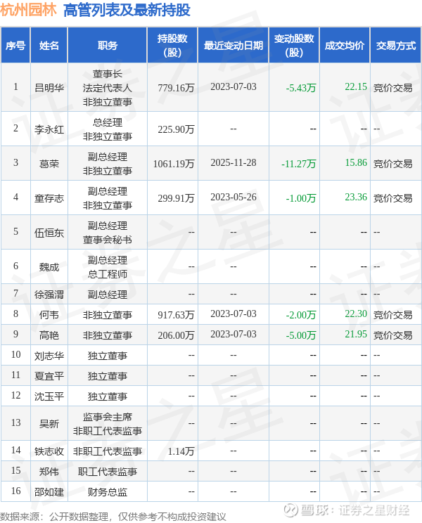杭州园林的高管列表及最新持股情况如下: