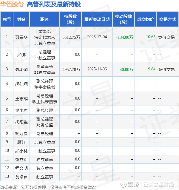 华伍股份近半年内的董监高及核心技术人员增减持详情如下: