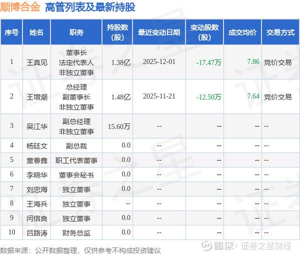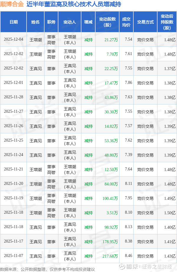 顺博合金近半年内的董监高及核心技术人员增减持详情如下: