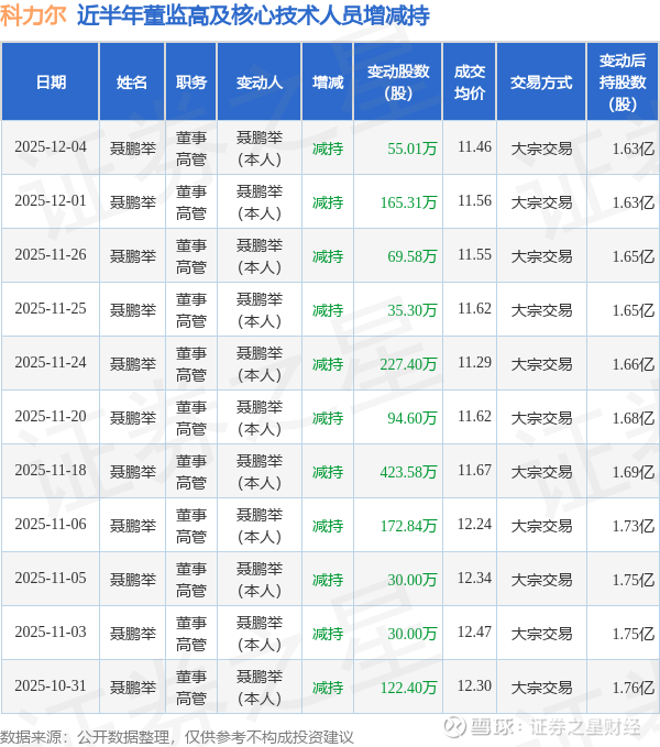 科力尔近半年内的董监高及核心技术人员增减持详情如下: