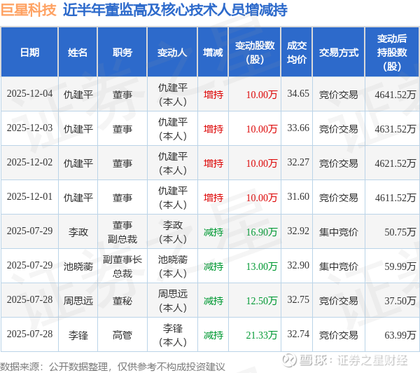 巨星科技近半年内的董监高及核心技术人员增减持详情如下: