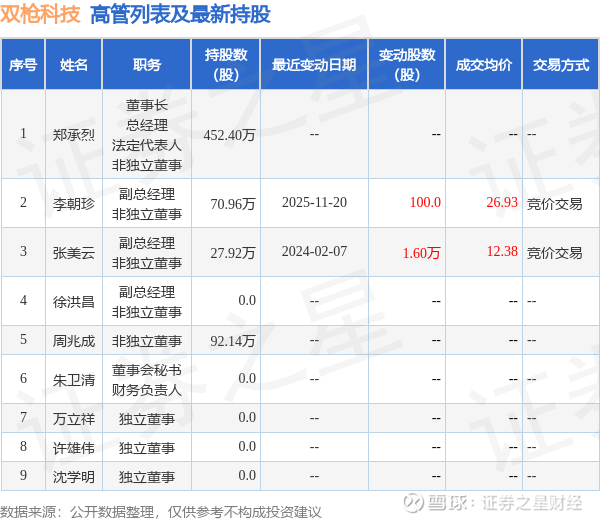 双枪科技近半年内的董监高及核心技术人员增减持详情如下: