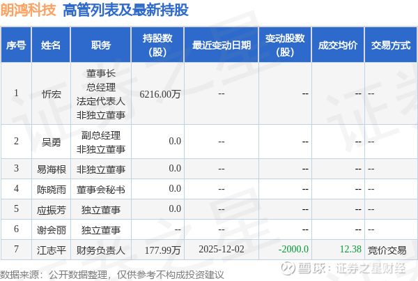 朗鸿科技的高管列表及最新持股情况如下: