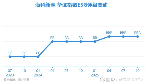 日前,华证指数公布了新一期(2025年10月31日)的ESG评级结果,海科新源(301292.SZ)获得BBB评级(华证指数评级为C起至AAA九档,C为最低档,AAA为其最高一级评级/AA为其第二档),上一期(2025年7月31日)ESG评级为BBB。本期ESG评级在494家化学制品行业A股上市公司中排名第108(上一期排名第99)。