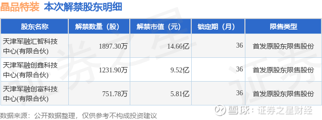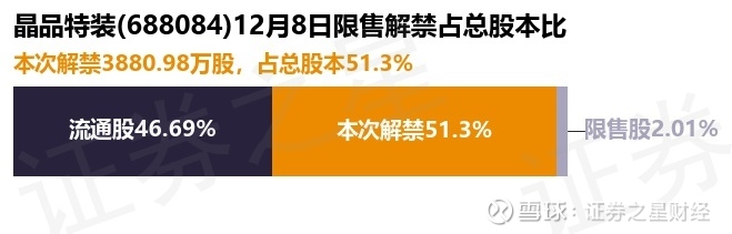 证券之星消息,根据市场公开信息整理,晶品特装(688084)于12月8日将有3880.98万股限售股份解禁,为公司首发原股东限售股份,占公司总股本51.3%。(本次数据根据历史公告整理得出,实际情况以上市公司最新公告为准)最近一年内,该股累计解禁76.0万股,占总股本的1.0%。本次解禁后,公司还有152.36万股限售股份,占总股本2.01%。具体如下图所示: