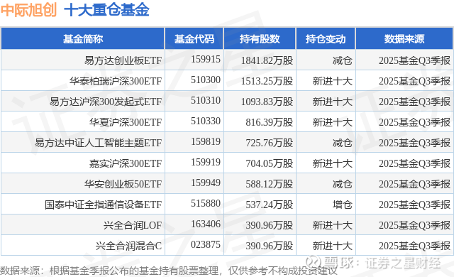 根据2025基金Q3季报公募基金重仓股数据,重仓该股的公募基金共1125家,其中持有数量最多的公募基金为易方达基金的易方达创业板ETF。易方达创业板ETF目前规模为102.0亿元,最新净值3.0902(12月5日),较上一交易日上涨1.36%,近一年上涨41.81%。该公募基金现任基金经理为成曦 刘树荣。成曦在任的基金产品包括:易方达创业板ETF联接A,管理时间为2016年5月7日至今,期间收益率为48.85%;易方达深证100ETF,管理时间为2016年5月7日至今,期间收益率为83.11%;易方达上证科创板50成份ETF,管理时间为2020年9月28日至今,期间收益率为-4.47%。刘树荣在任的基金产品包括:易方达深证100ETF联接A,管理时间为2017年7月18日至今,期间收益率为61.99%;易方达创业板ETF联接A,管理时间为2017年7月18日至今,期间收益率为84.8%;易方达深证100ETF,管理时间为2017年7月18日至今,期间收益率为61.65%;